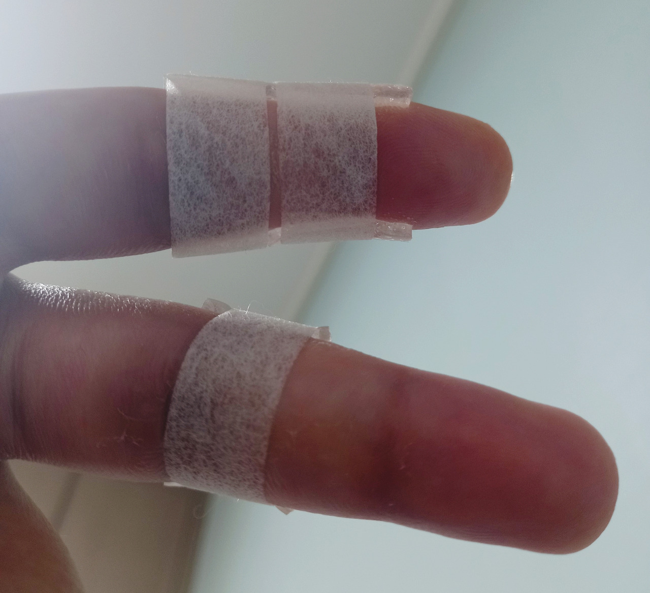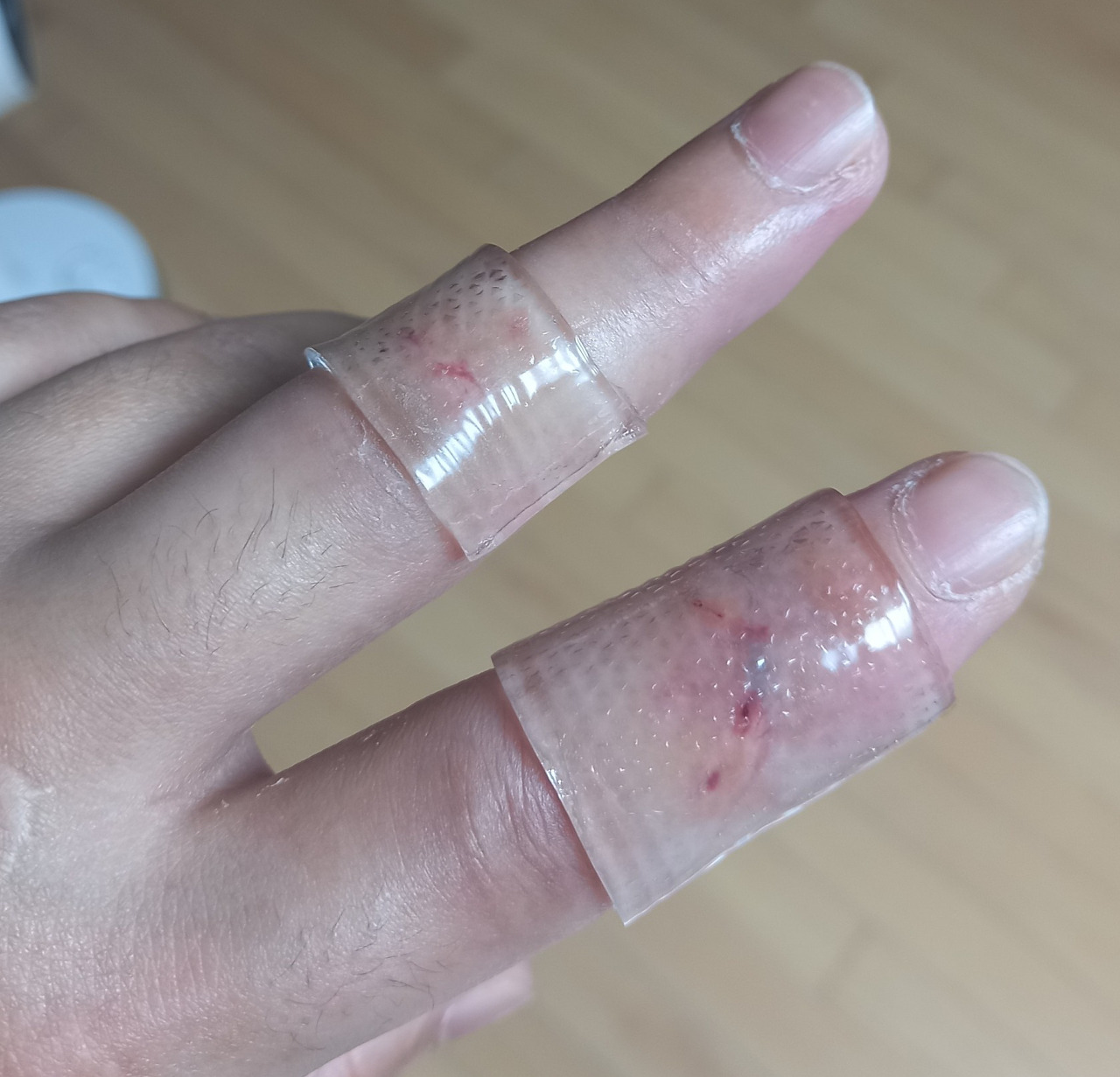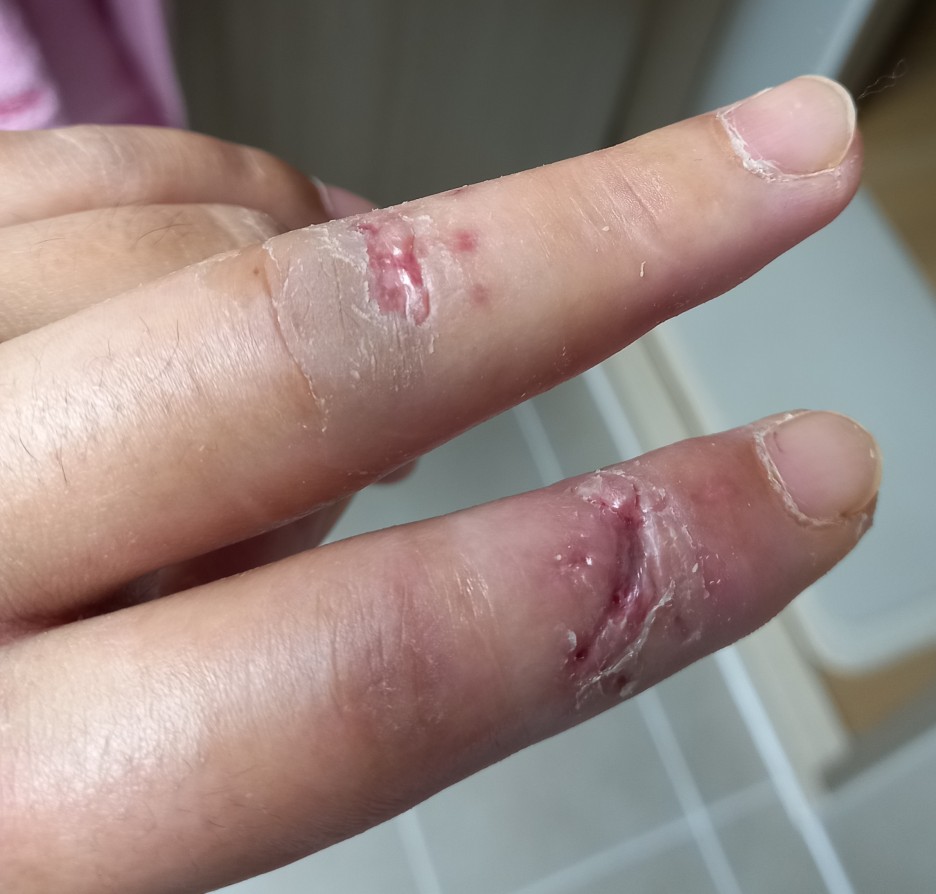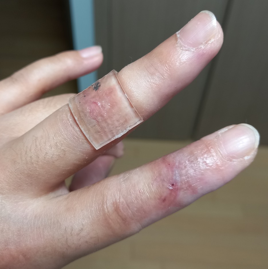 한 달 전에 여자친구랑 태안에 있는 펜션으로 놀러 갔어요. 재밌게 놀고 다음날 집에 가려고 짐을 싸던 중 칼이 손가락 위로 떨어지면서 스쳤어요. 그로 인해 검지의 힘줄이 완전히 끊어지고 중지까지 상처를 입어서 수술을 받고 깁스를 했어요.