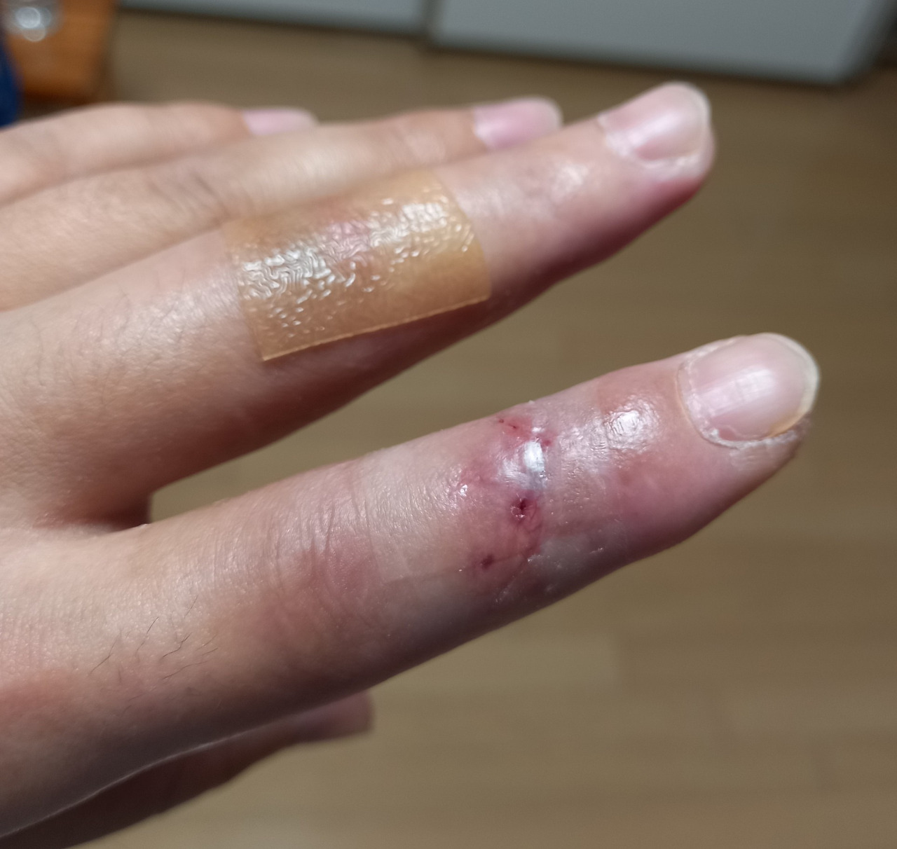 한 달 전에 여자친구랑 태안에 있는 펜션으로 놀러 갔어요. 재밌게 놀고 다음날 집에 가려고 짐을 싸던 중 칼이 손가락 위로 떨어지면서 스쳤어요. 그로 인해 검지의 힘줄이 완전히 끊어지고 중지까지 상처를 입어서 수술을 받고 깁스를 했어요.