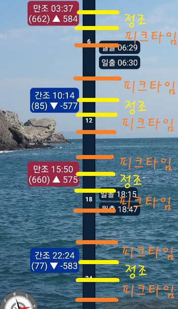 --> 정조가 끝나고 물이 빠지기(or 차기) 시작할 때부터 30분~1시간은 피딩 타임이다. 이때가 피크이고만조(or 간조)가 되기 30분에서 1시간 전이 또 피크시간이다. 위에 조류 세기가 있는 걸 봤을 것이다. 조류가 세다는 것은 물고기도 잘 잡힌다는 뜻이니깐 조류의 세기를 확인하고 낚시를 하면 더 좋다. (조류↑=물고기↑)