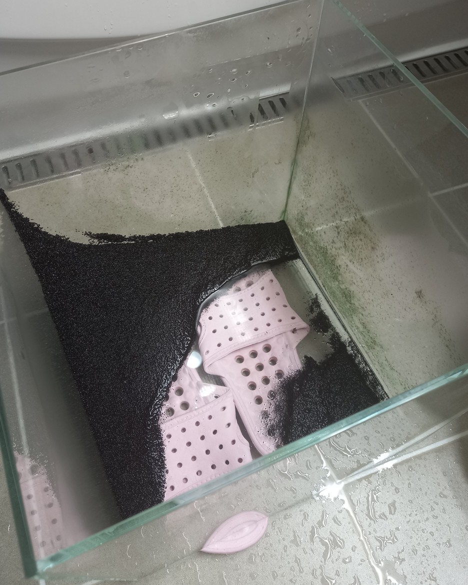 깨질까 봐 화장실 슬리퍼에 일단 올리고 안에 있는 검은 모래들을 다 빼주었어요...