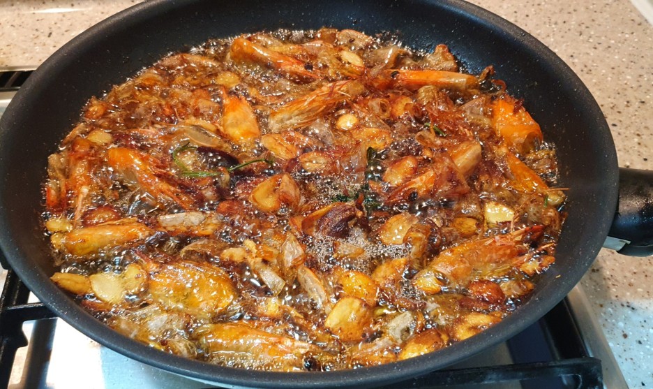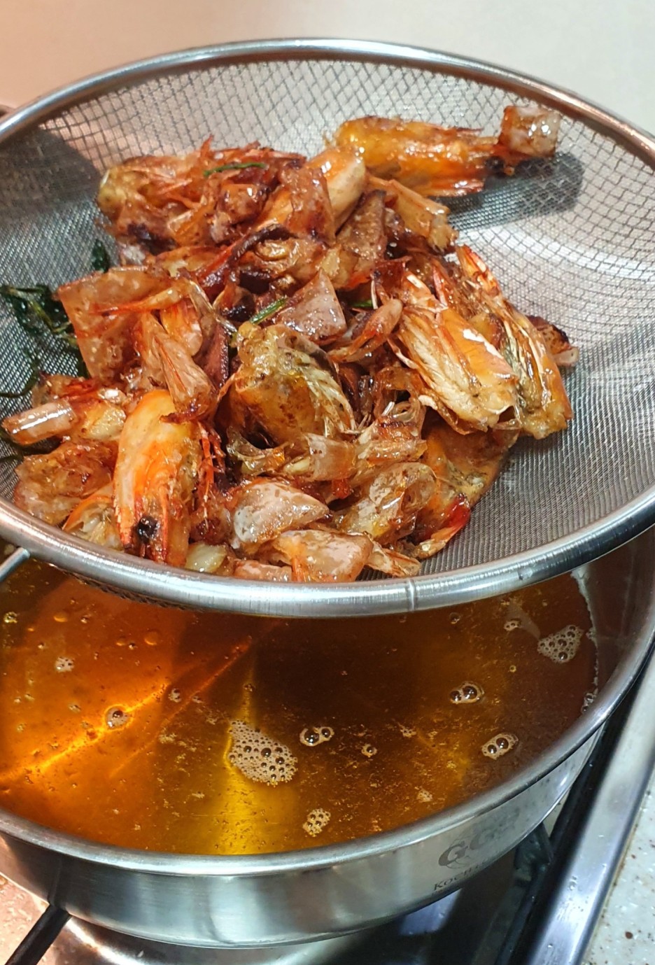 1. 새우의 머리와 껍질을 기름에서 우린다.