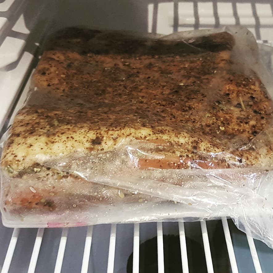 그 밑에 Cure salt라고 써져있는 것을 확인하실 수 있어요. 자세한 건 뒤에 다룰 거지만 일단 간단하게 보툴리누스라는 균을 막기 위해서 쓴다고 보시면 돼요. Pink salt라고도 하는데 여기서 또 #1과 #2로 나누어져요 이 책에서 쓰는 Pink salt는 #1을 뜻하는 거예요'Pink salt #1'은 소금이 93.75% 아질산염 6.25%들어가 있는 소금을 뜻하는 거라고 알고 계시면 됩니다. 하지만 저 같은 경우 Pink salt #1을 구할 수 없어서 한국에서 파는 '피클링 솔트'를 이용하였는데 이 소금에는 아질산염이 8.4%들어 있어요. 책의 레시피를 토대로 비례식을 써보면 삼겹살 1823g에 Pink salt #1을 11.34g을 써야 하는데 저는 4g을 쓴 걸 확인해 보실 수 있어요. 일단 제가 쓴 피클링 솔트에는 아질산염이 8.4%가 들어 있으니깐 좀 줄여서 8g 정도를 쓴다고 볼게요 거기서 반을 더 뺐어요 이유는 레시피상에서는 8~15도의 온도와 60% 습도에서 2주 동안 드라이시키라고 했는데 저는 5도 이하의 냉장고에서 드라이 시킬 거라서 굳이 많이 쓸 필요를 못 느껴서 반을 쳐 냈습니다. 어디 팔 것도 아니고 홈메이드고 조금은 안전하게 먹으려고 한 것이었죠.