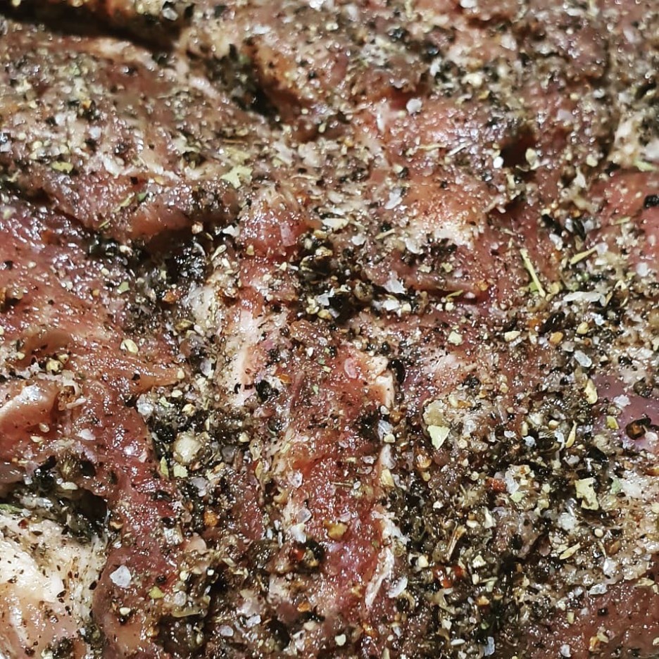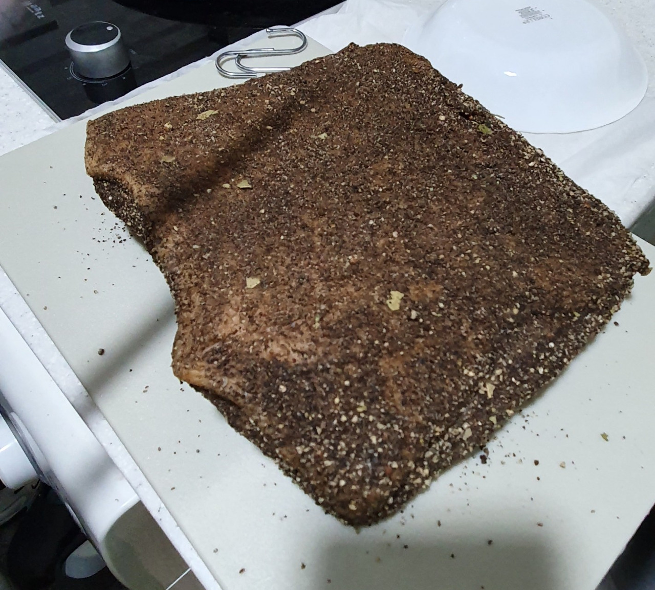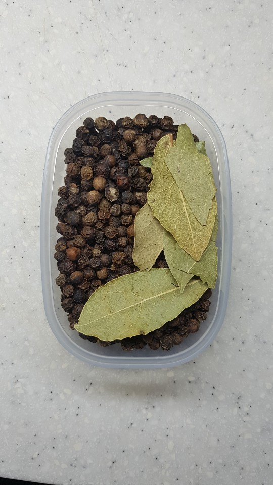 9. 레시피에는 남은 절반만 갈아서 겉면에 바르라고 되어있었습니다. 하지만 남아 있는 후추 양이 적어 보여서 남아 있는 흑후추 17g에 8g 더 추가해서 25g으로 맞춰주었고 월계수잎도 몇 장 넣고 갈아 주었습니다.