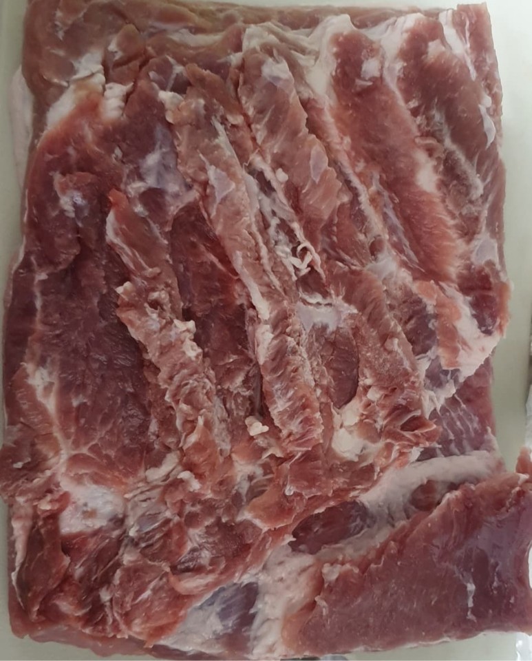 1. 먼저 돼지고기 삼겹살을 준비해 줍니다. 중간중간에 있는 뼈는 칼로 잘 도려내 줍니다.