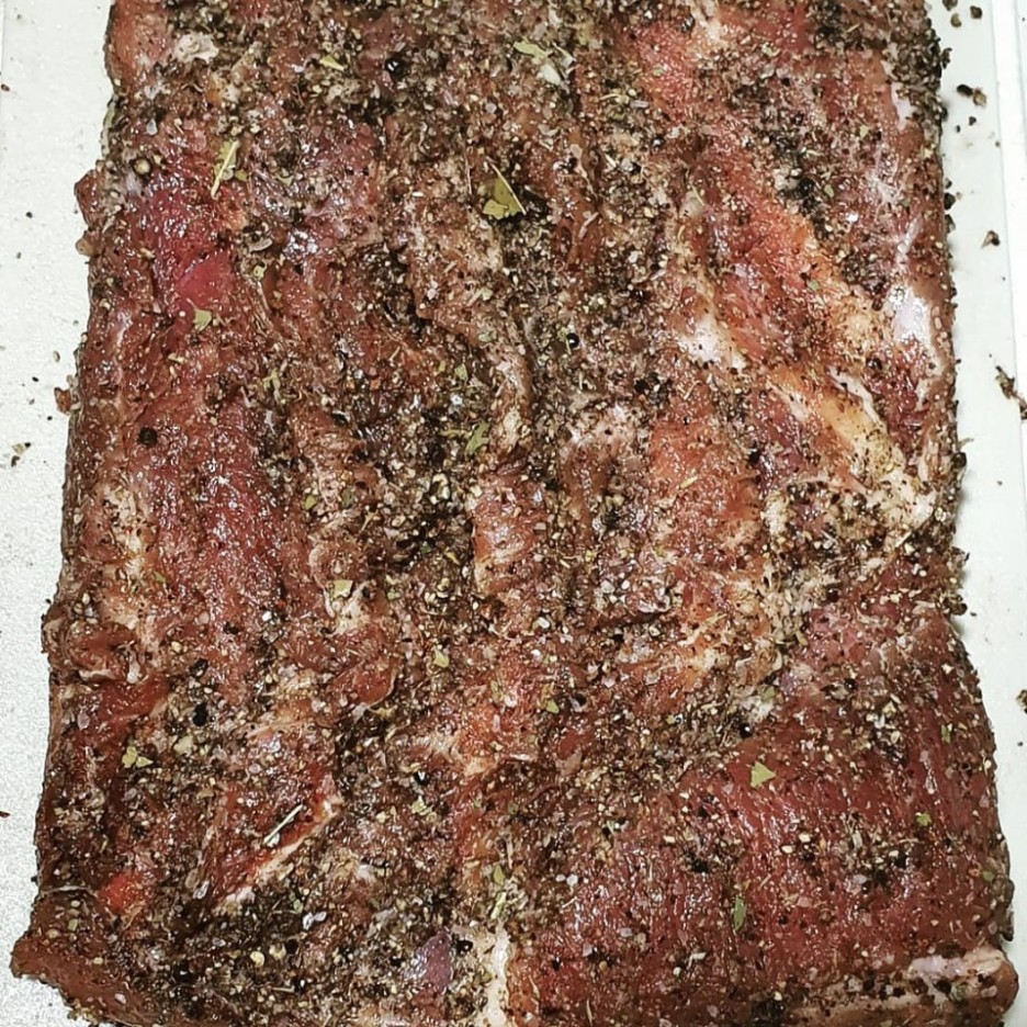 9. 레시피에는 남은 절반만 갈아서 겉면에 바르라고 되어있었습니다. 하지만 남아 있는 후추 양이 적어 보여서 남아 있는 흑후추 17g에 8g 더 추가해서 25g으로 맞춰주었고 월계수잎도 몇 장 넣고 갈아 주었습니다.