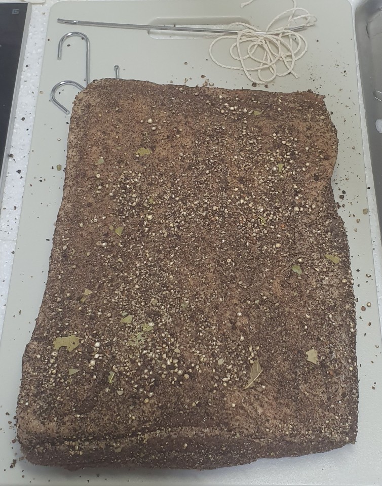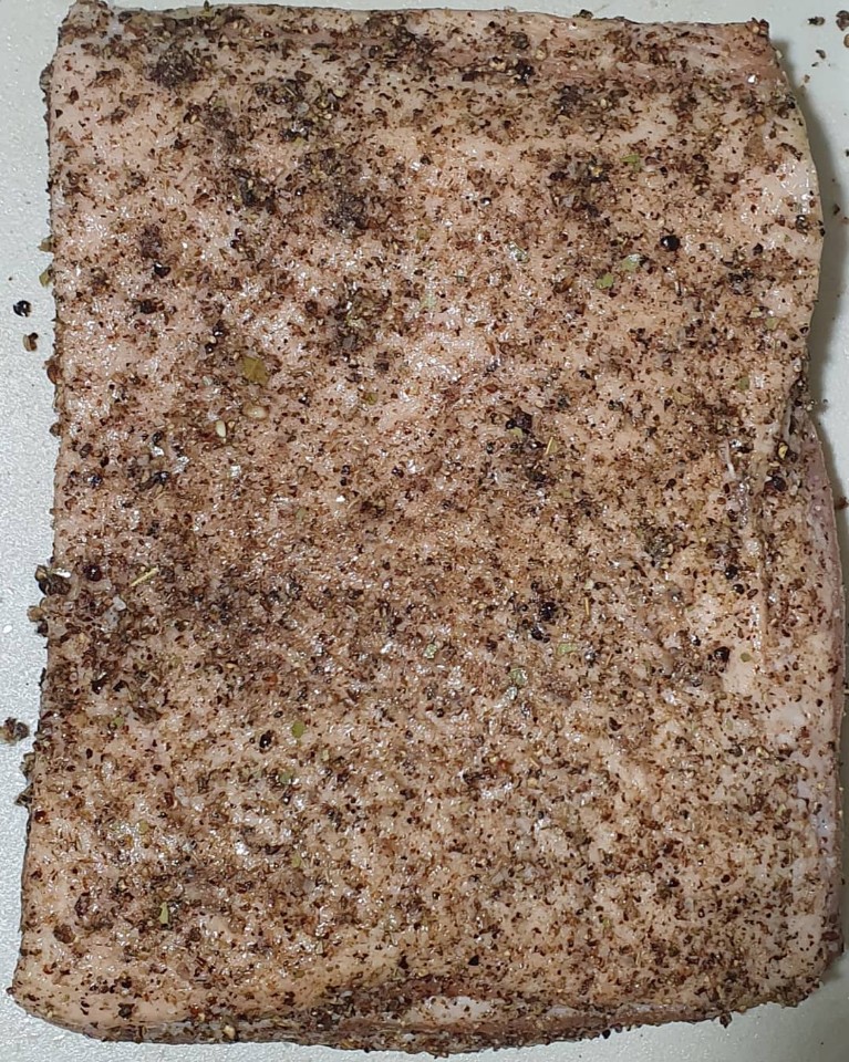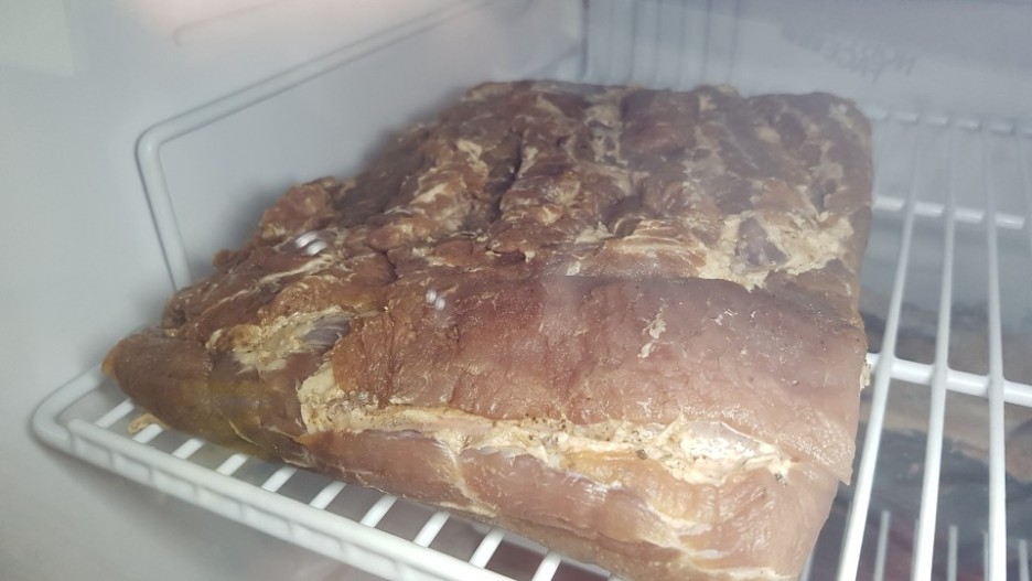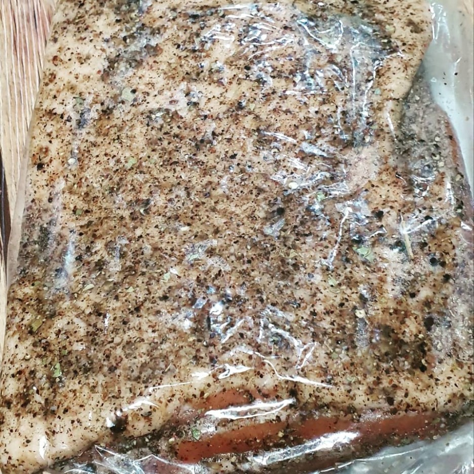 그 밑에 Cure salt라고 써져있는 것을 확인하실 수 있어요. 자세한 건 뒤에 다룰 거지만 일단 간단하게 보툴리누스라는 균을 막기 위해서 쓴다고 보시면 돼요. Pink salt라고도 하는데 여기서 또 #1과 #2로 나누어져요 이 책에서 쓰는 Pink salt는 #1을 뜻하는 거예요'Pink salt #1'은 소금이 93.75% 아질산염 6.25%들어가 있는 소금을 뜻하는 거라고 알고 계시면 됩니다. 하지만 저 같은 경우 Pink salt #1을 구할 수 없어서 한국에서 파는 '피클링 솔트'를 이용하였는데 이 소금에는 아질산염이 8.4%들어 있어요. 책의 레시피를 토대로 비례식을 써보면 삼겹살 1823g에 Pink salt #1을 11.34g을 써야 하는데 저는 4g을 쓴 걸 확인해 보실 수 있어요. 일단 제가 쓴 피클링 솔트에는 아질산염이 8.4%가 들어 있으니깐 좀 줄여서 8g 정도를 쓴다고 볼게요 거기서 반을 더 뺐어요 이유는 레시피상에서는 8~15도의 온도와 60% 습도에서 2주 동안 드라이시키라고 했는데 저는 5도 이하의 냉장고에서 드라이 시킬 거라서 굳이 많이 쓸 필요를 못 느껴서 반을 쳐 냈습니다. 어디 팔 것도 아니고 홈메이드고 조금은 안전하게 먹으려고 한 것이었죠.