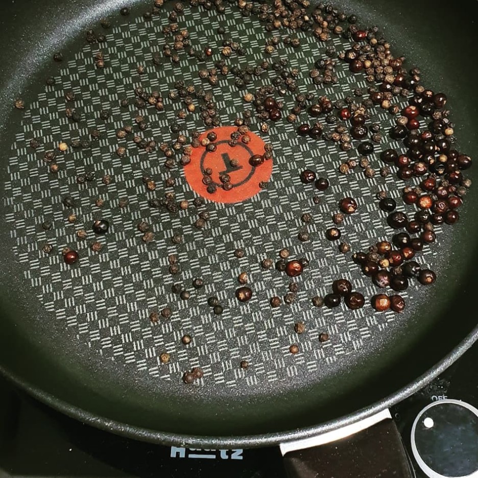 2. 흑후추 16g과 주니퍼베리 8g을 프라이팬에 살짝 볶아 줍니다.