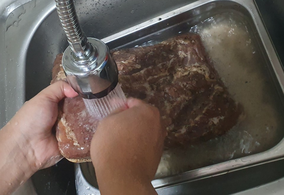 7. 10일이 지나서 뺀 후에 찬물로 깨끗이 씻어주었습니다.지방도 있고 살이 상할 수 있기 때문에 손이 시려도 찬물로 씻어주세요.