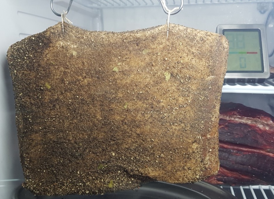 11. 책에서는 면포에 돌돌 말아서 말리는 걸 볼 수 있는데 저 같은 경우 마는 것보다 이게 더 보관하기도 좋을 거 같아서 이런 식으로 말렸습니다. 이렇게 냉장고 안에서 한 달정도 말려 주었습니다. 습도는 30%~80% 사이였어요.