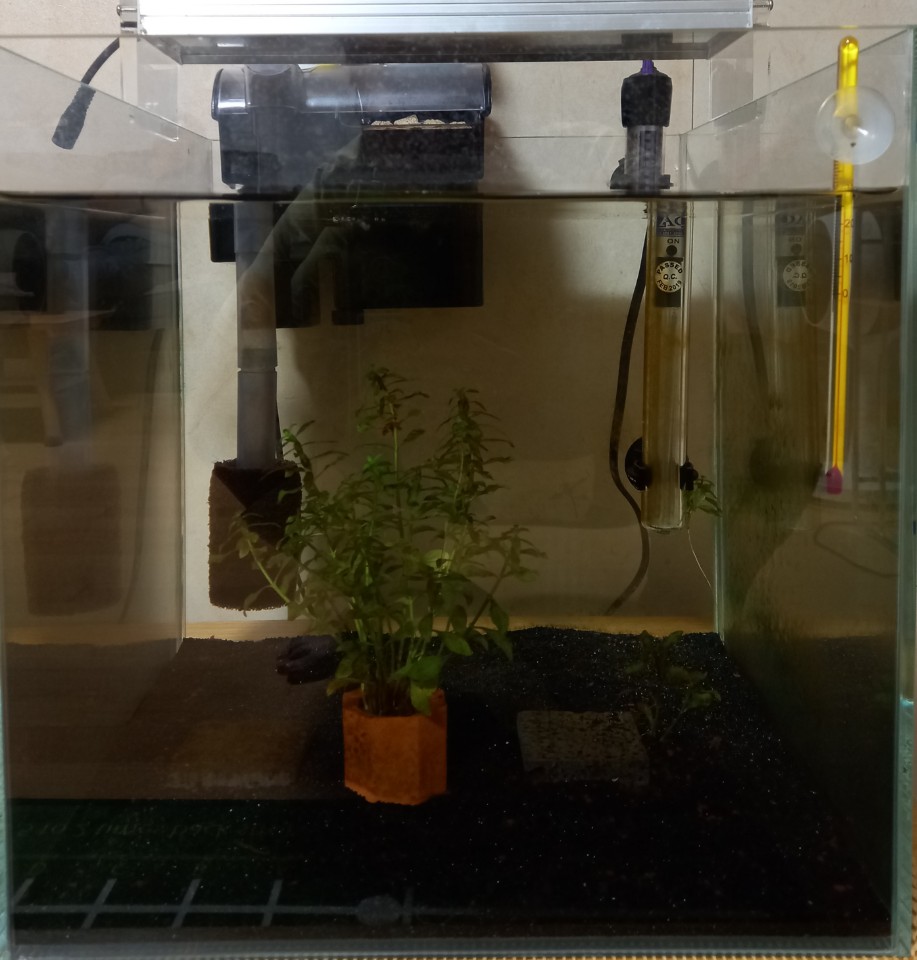 30큐브에 걸이식 여과기와 온도계 그리고 고장 난 LED 등이 있는 어항이다.