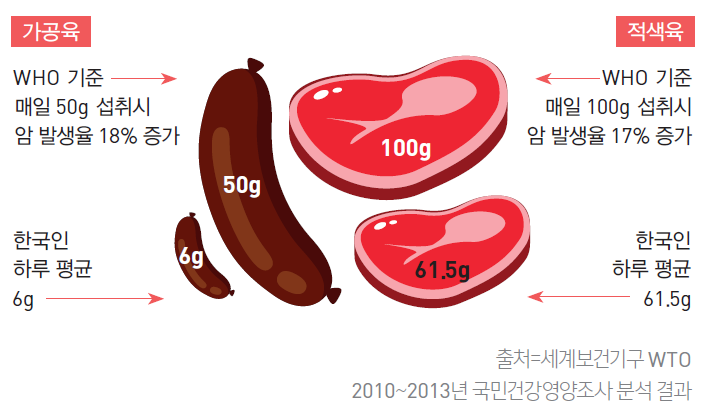 IARC는 전 세계 적색육 섭취 인구의 중간 섭취량을 1 일 50∼100g으로, 많이 섭취하는 경우를 하루 200g 이상으로 제시하고 있으니 우리는 우려할 정도가 아닌 거죠 ㅎㅎ